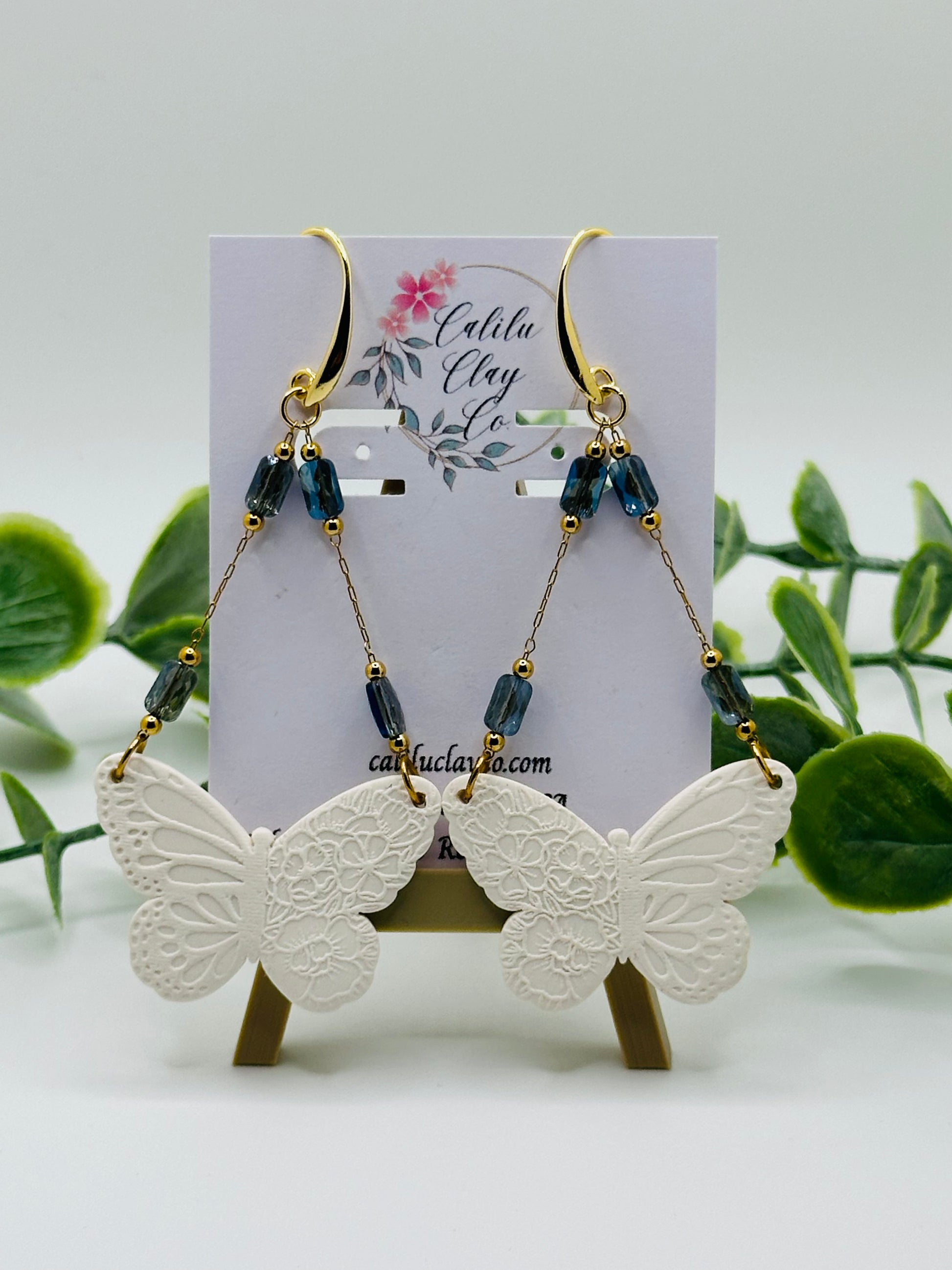Unique, One-of-a-Kind, Handcrafted Polymer Clay earrings. Elegant, Classy white butterflies dangle from gold stainless steel chain with blue glass crystal beads. These lightweight, adorable earrings will complement any outfit :)