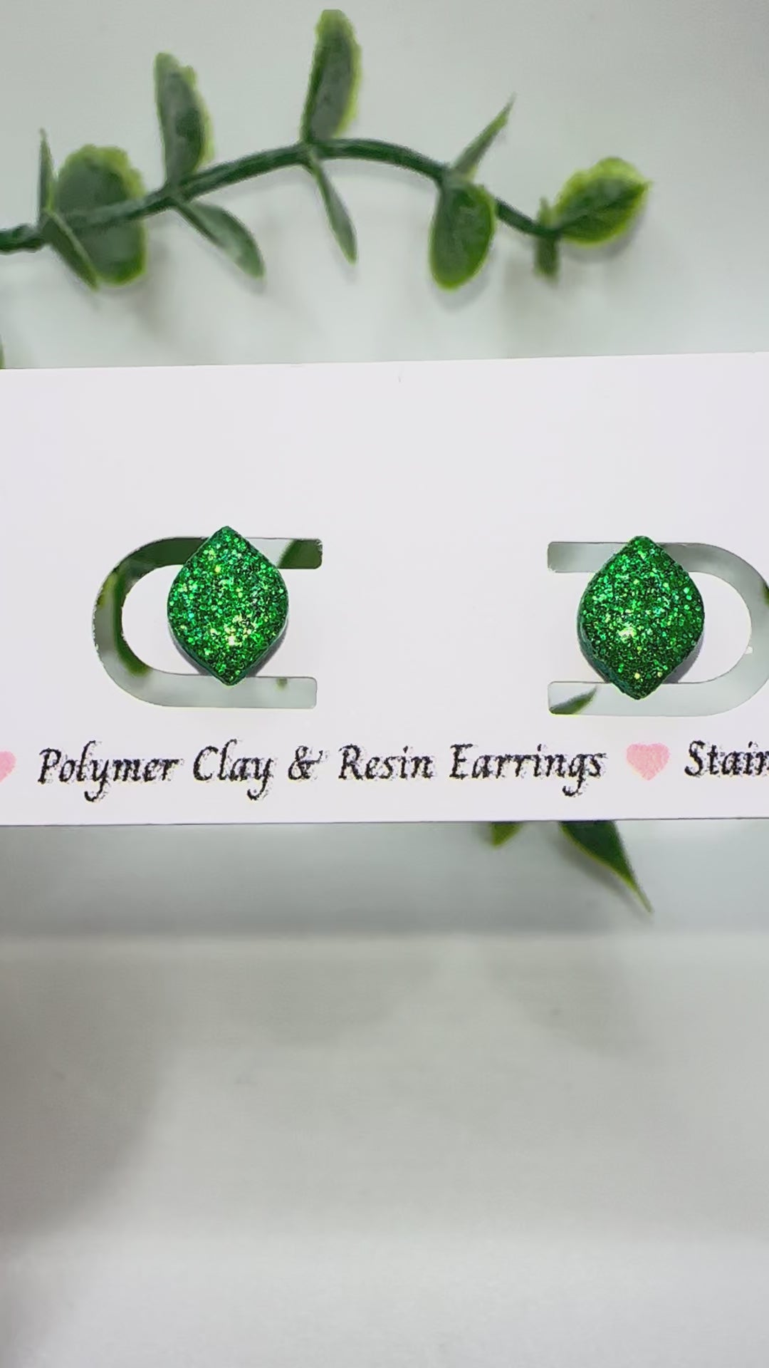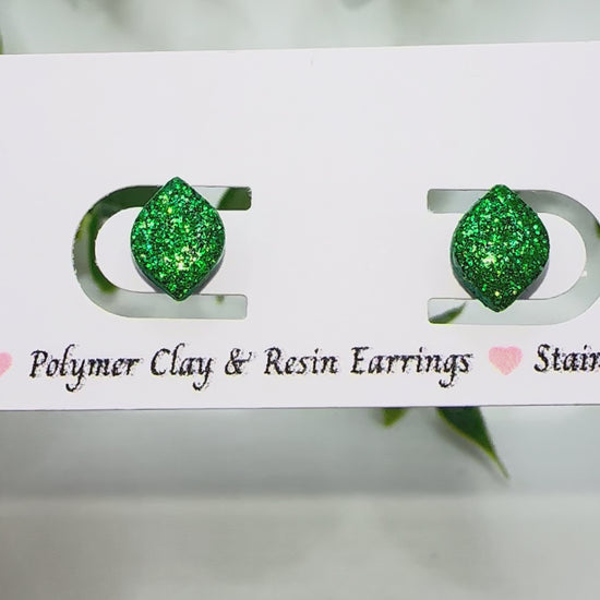 Unique, Handcrafted Polymer Clay earrings. Adorable, green holographic rounded diamond studs - .25in, sealed with Brite Tone. These lightweight, adorable earrings will complement any outfit :)
